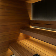 The Novara Prestige Glass Indoor Sauna is designed for those who desire a refined blend of tradition and modern elegance. Featuring clear glass panels framed in a dark structure, this sauna showcases warm wood interiors with dual-level benches and a powerful stone heater. Integrated LED lighting beneath the benches and in the ceiling creates a soothing ambiance, while the minimalist design ensures it complements any luxury home or spa environment.
